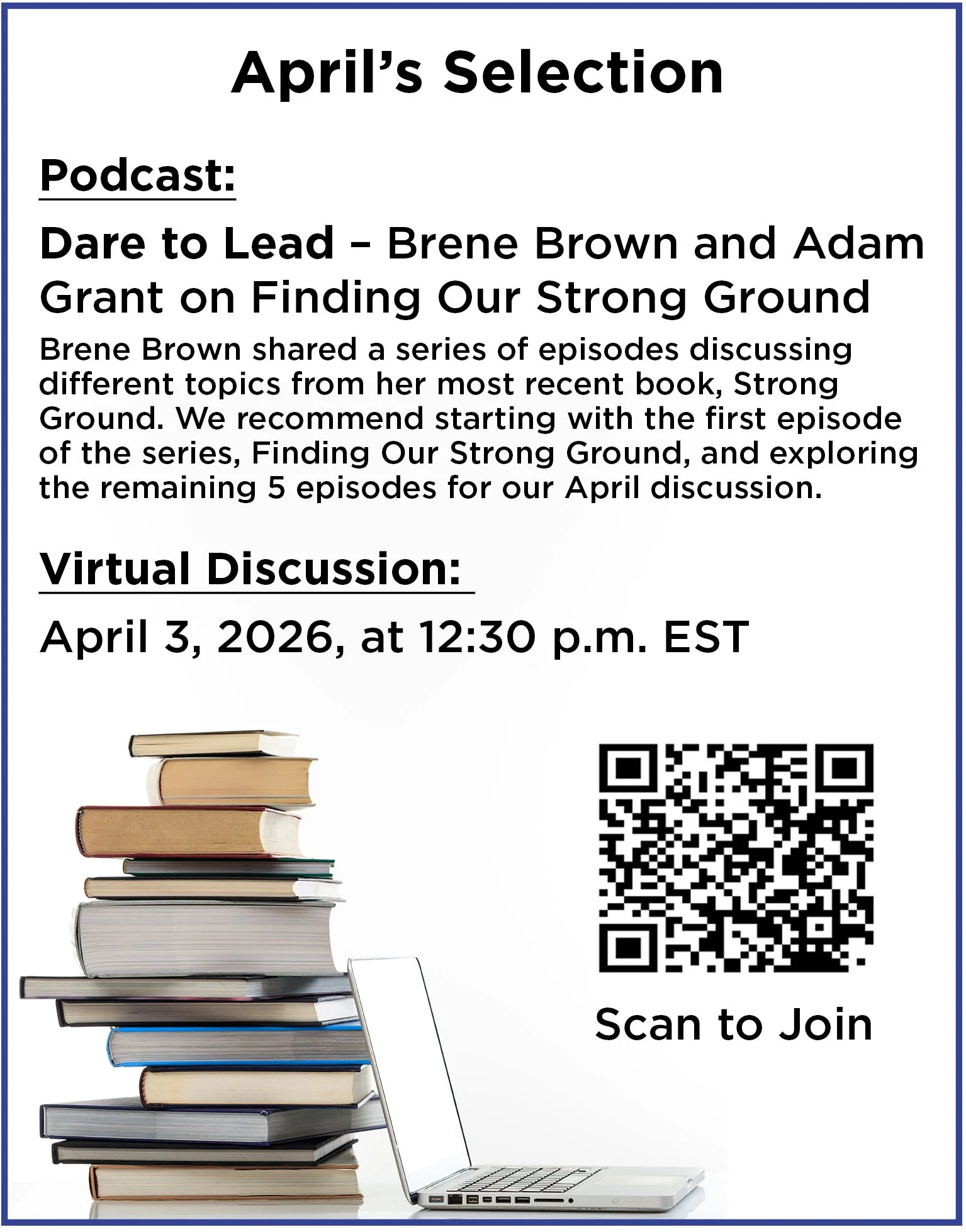 Brene Brown shared a series of episodes discussing different topics from her most recent book, Strong Ground. We recommend starting with the first episode of the series, Finding Our Strong Ground, and exploring the remaining 5 episodes for our April discussion.